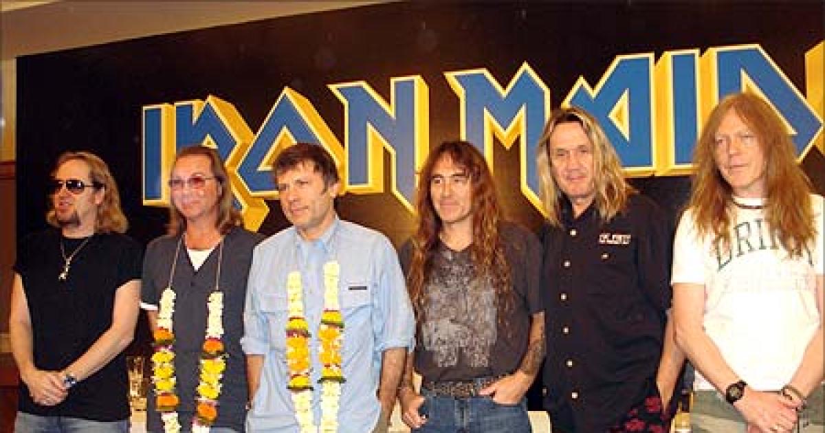 The Iron Maiden band -- comprising of Steve Harris (guitarist and founding member of the band), Bruce Dickinson (lead singer), Nicko McBrain (drummer), Dave Murray (guitarist) and Adrian Smith (guitarist) -- were garlanded desi-style as they took their seats. However, guitarist Janick Gers arrived much later.