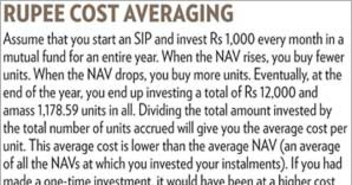 Cost averaging. By buying fewer units when the NAV is high and more units when it is low, your buying cost per unit gets averaged out. This is called rupee cost averaging (see Rupee Cost Averaging).