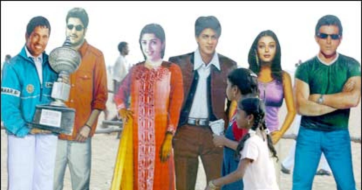 Two girls pass by a series of celebrity cut-outs as they decide which one to be photographed with at an open-air studio on a beach in Chennai.