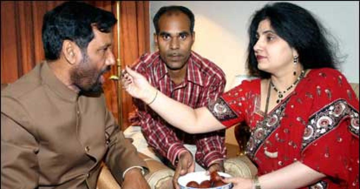 Lok Janshakti Party leader Ramvilas Paswan's wife gives him sweets.