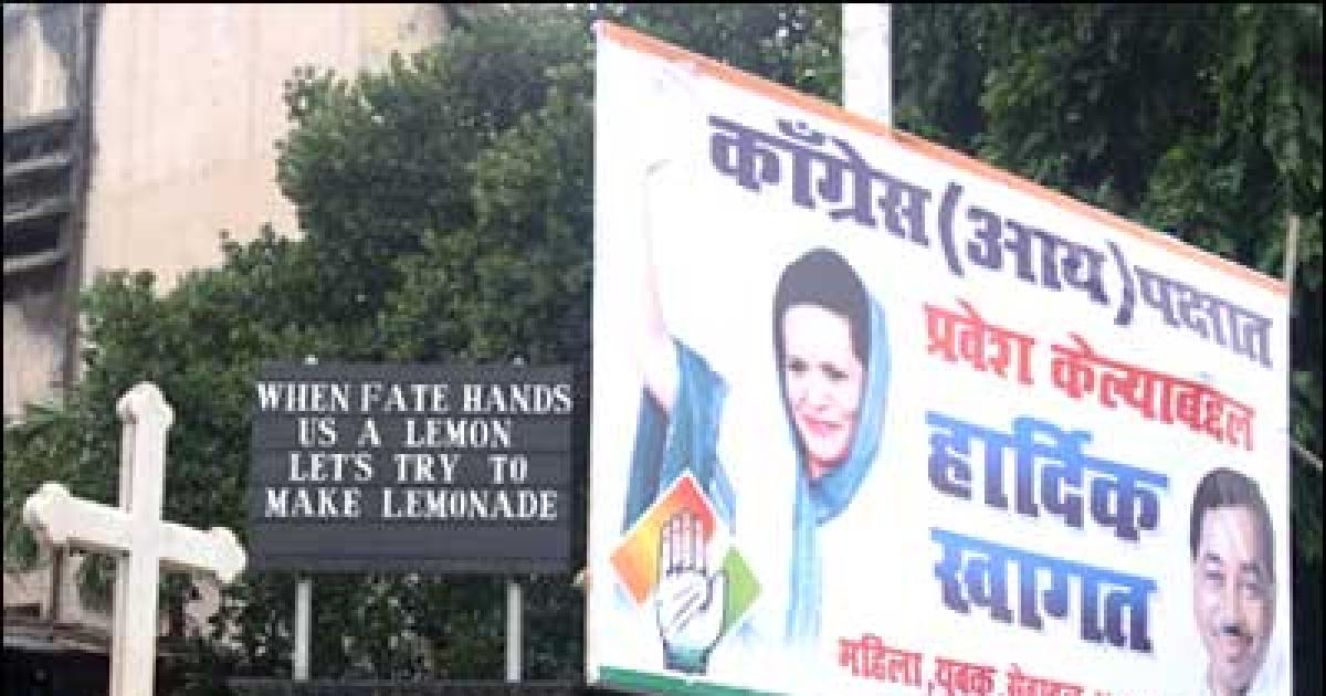 (A banner near St Michael's Church welcomes Rane into the Congress party.)
