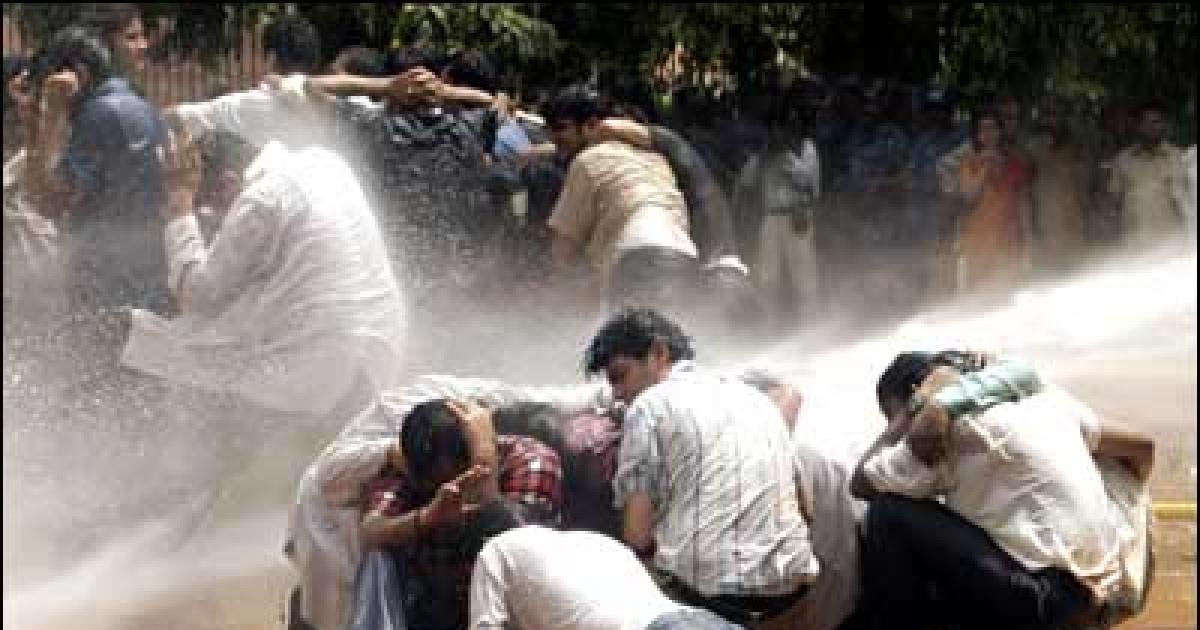 Police lobbed tear gas shells and used water cannons to keep medical students, protesting the government's controversial reservation proposal in New Delhi on Friday, from moving towards the Prime Minister's Office in South Block.