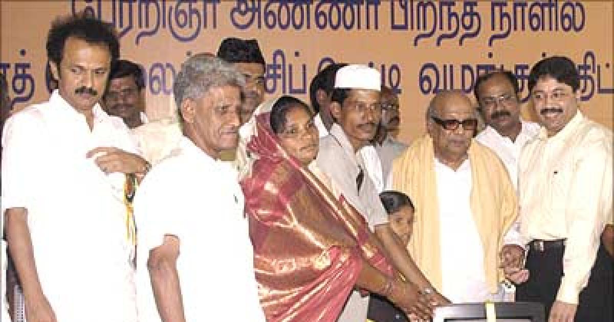 Image: Tamil Nadu Chief Minister M Karunanidhi distributing a colour TV set to a family. Union Communication Minister Dayanidhi Maran (right) and state Local Administration Minister and Karunanidhi's son M K Stalin (left) were also present.