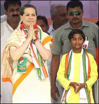 Sadhana talks like a sycophantic vet, all fire and brimstone as she constantly invokes herself into her speech. She calls herself a daughter to everyone from Rahul Gandhi to Prime Minister Manmohan Singh, and asks for the public's applause. Initially amused, the crowds indulge her -- till the Congress announcer cuts her short and tersely asks her, again, to wind up.