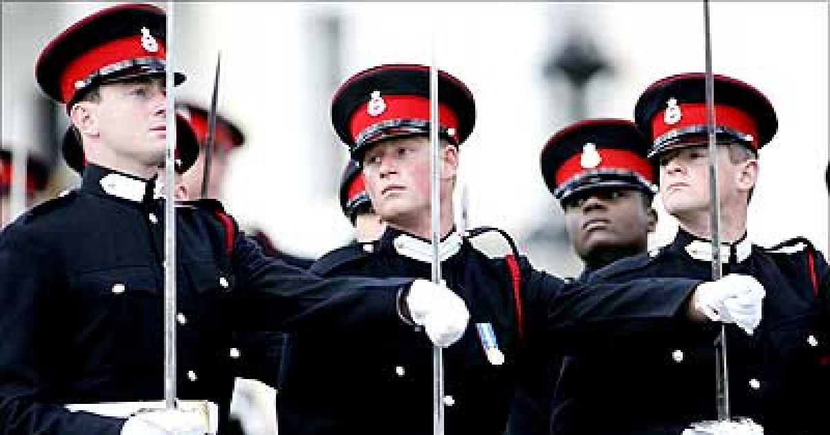 Photograph: Britain's Prince Harry marches during the Sovereign's Parade at the Royal Military Academy in Sandhurst, April 12, 2006. Officer Cadet H Wales as Prince Harry is known, will train to become a troop commander, in charge of 11 enlisted men and four light tanks -- a job that will soon see him on front-line duty in Iraq.