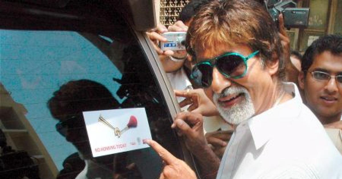 Image: Actor Amitabh Bachchan shows a sticker with the slogan 'No honking today' on his vehicle.