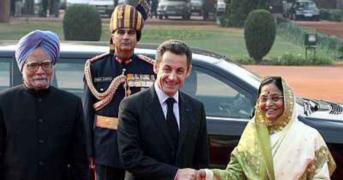 Caption: Prime Minister Manmohan Singh, French President Nicholas Sarkozy and President Pratibha Patil at Rashtrapati Bhavan in Delhi on Friday.