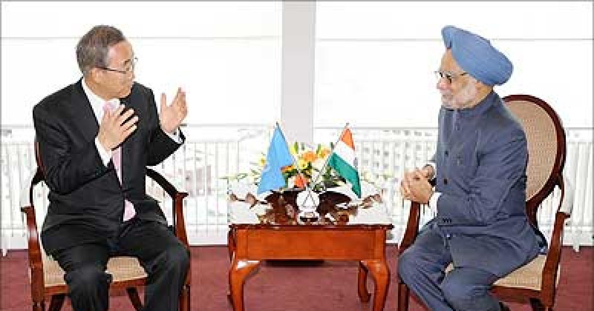 Image: Ban Ki-Moon and Manmohan Singh during the meeting in Japan on Tuesday; Photograph: TORU YAMANAKA/AFP/Getty Images