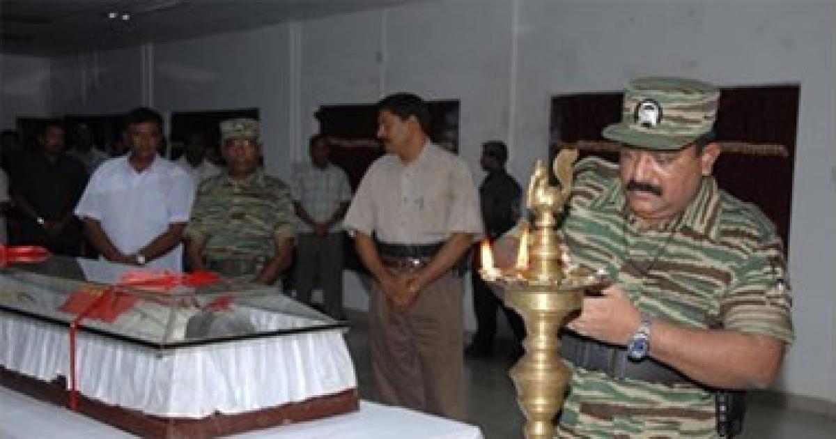 Attired in combat fatigues with a Tiger emblem on his cap and sporting a steel wrist watch, the well-built 54-year-old Prabhakaran offered floral tributes to K Sivanesan, a Tamil National Alliance MP who was killed in a roadside bomb attack, on Saturday, according to photographs released by the LTTE, and reproduced alongside.