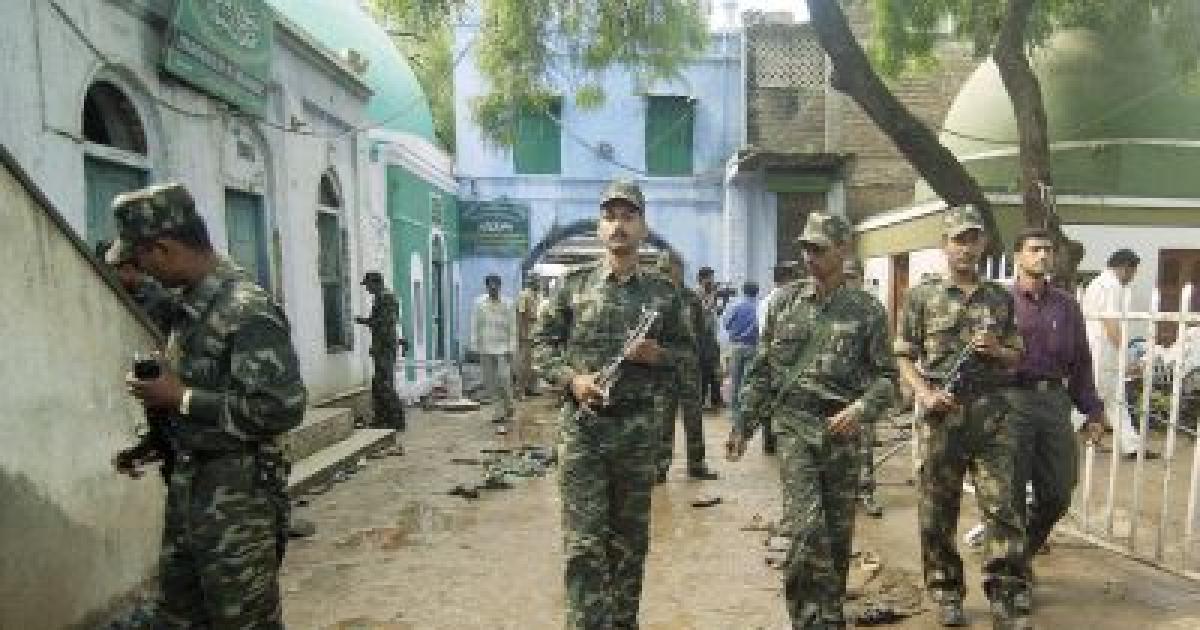 Image: Soldiers from the Quick Response Team patrol the area outside a mosque in Malegaon