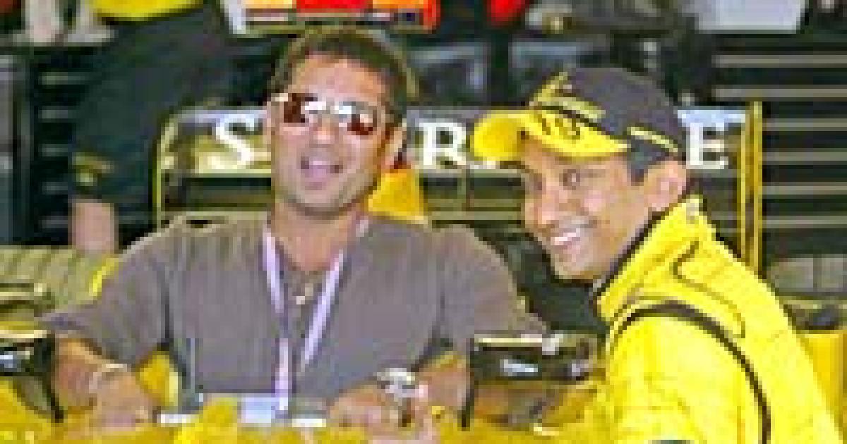 The pair posed beside Karthikeyan's car and the batting ace sat in the cockpit amid the roars as the Jordan engineers tested the engine in Portuguese team mate Tiago Monteiro's car.