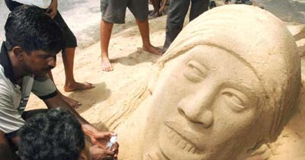 Indian football fans give the final touches to a sand sculpture of Brazilian football star Ronaldinho, in Kolkata.