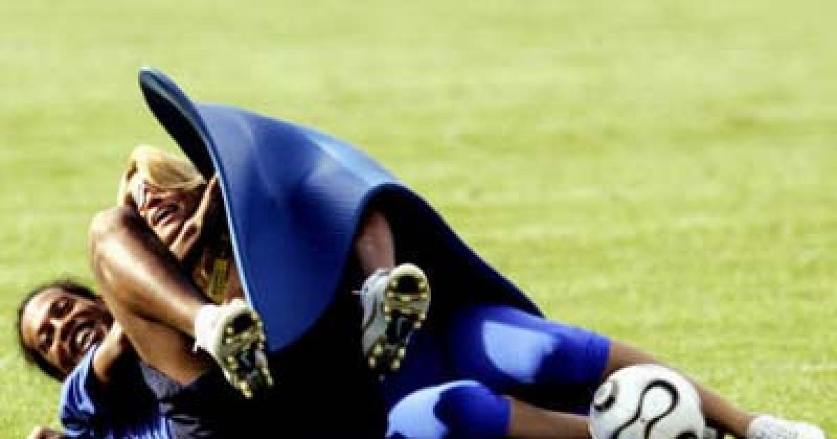 The blonde-haired woman jumped the fence around the field and appeared to land a kiss on the World Player of the Year Brazil striker Robinho jokingly threw a mattress over the pair.