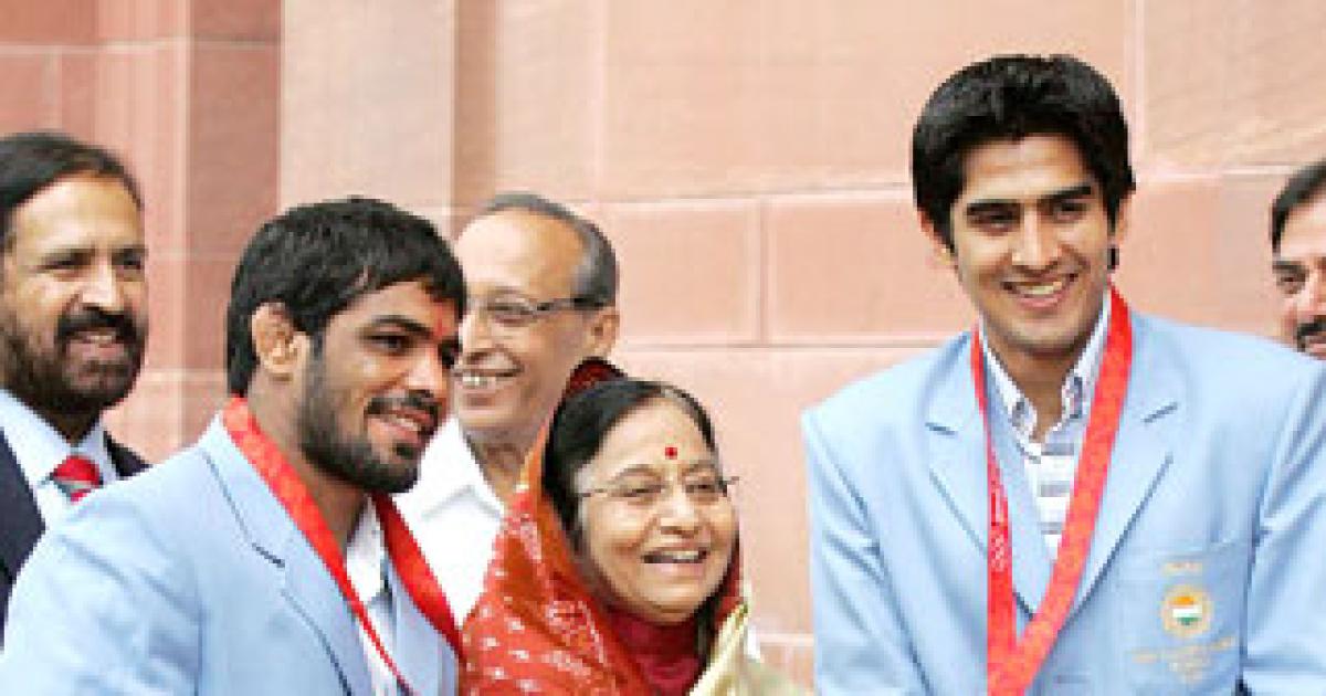 Wrestler Sushil Kumar and pugilist Vijender Kumar, who won a bronze medal each at the Beijing Olympics, pose with the India's President Pratibha Patil in New Delhi on Tuesday.
