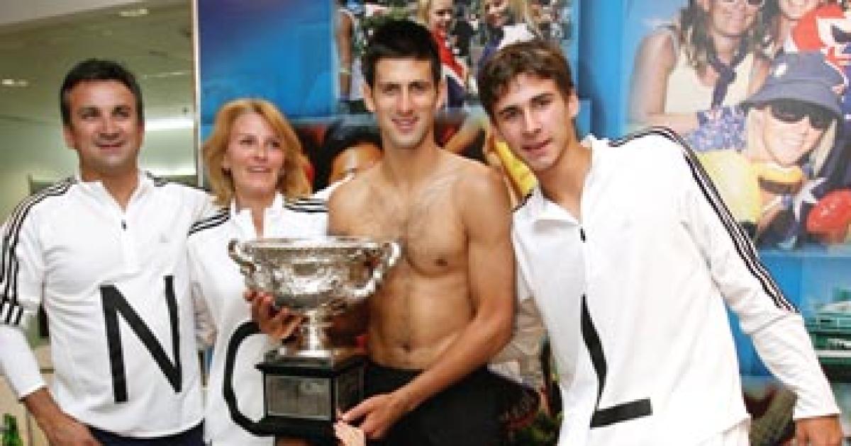 Photograph: Novak Djokovic celebrates in the locker room with his parents and two younger brothers/Getty Images