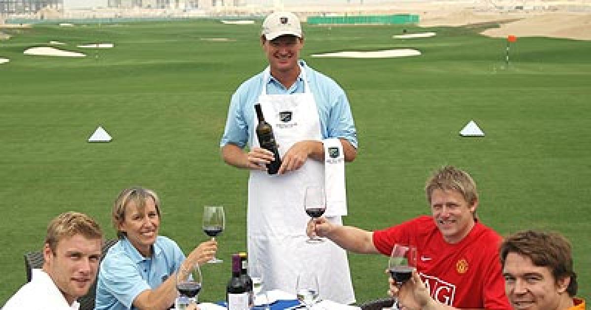 South African golfer Ernie Els uncorks the wine for England's Andrew Fintoff, tennis legend Martina Navratilova, former Manchester United goalkeeper Peter Schmeichel of Denmark and former captain of the World Champion South African rugby team John Smit during the launch of the Els Course at Dubai Sports City on Monday.