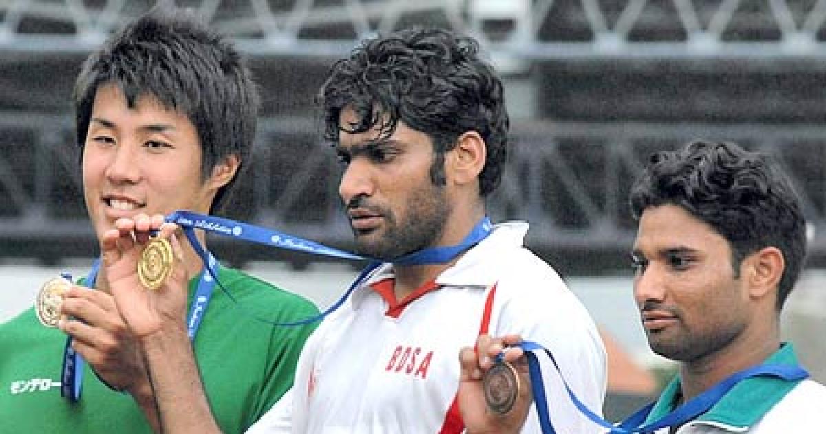 Gold medalist Anil Singh from India (center), silver medalist Yamamoto Kazuki from Japan (left) and bronze medal winner Sandeep Yadav from India show their medals during an awards ceremony for the men's Javelin throw event during the opening day of the 2nd Asian All Star Athletic competition in Bhopal on Thursday.